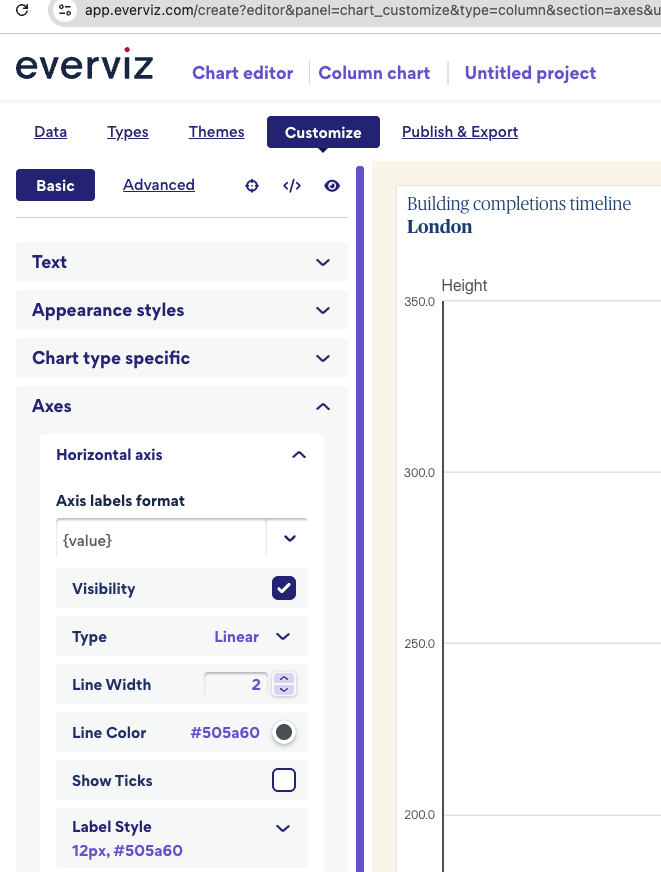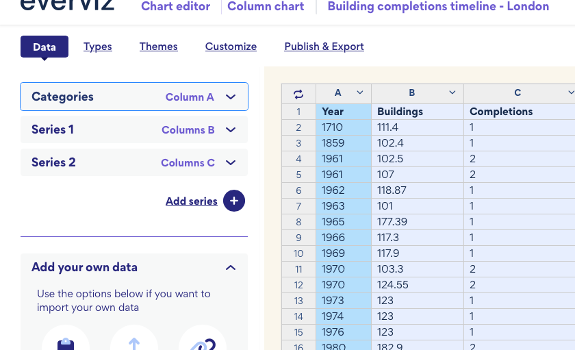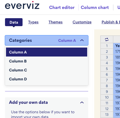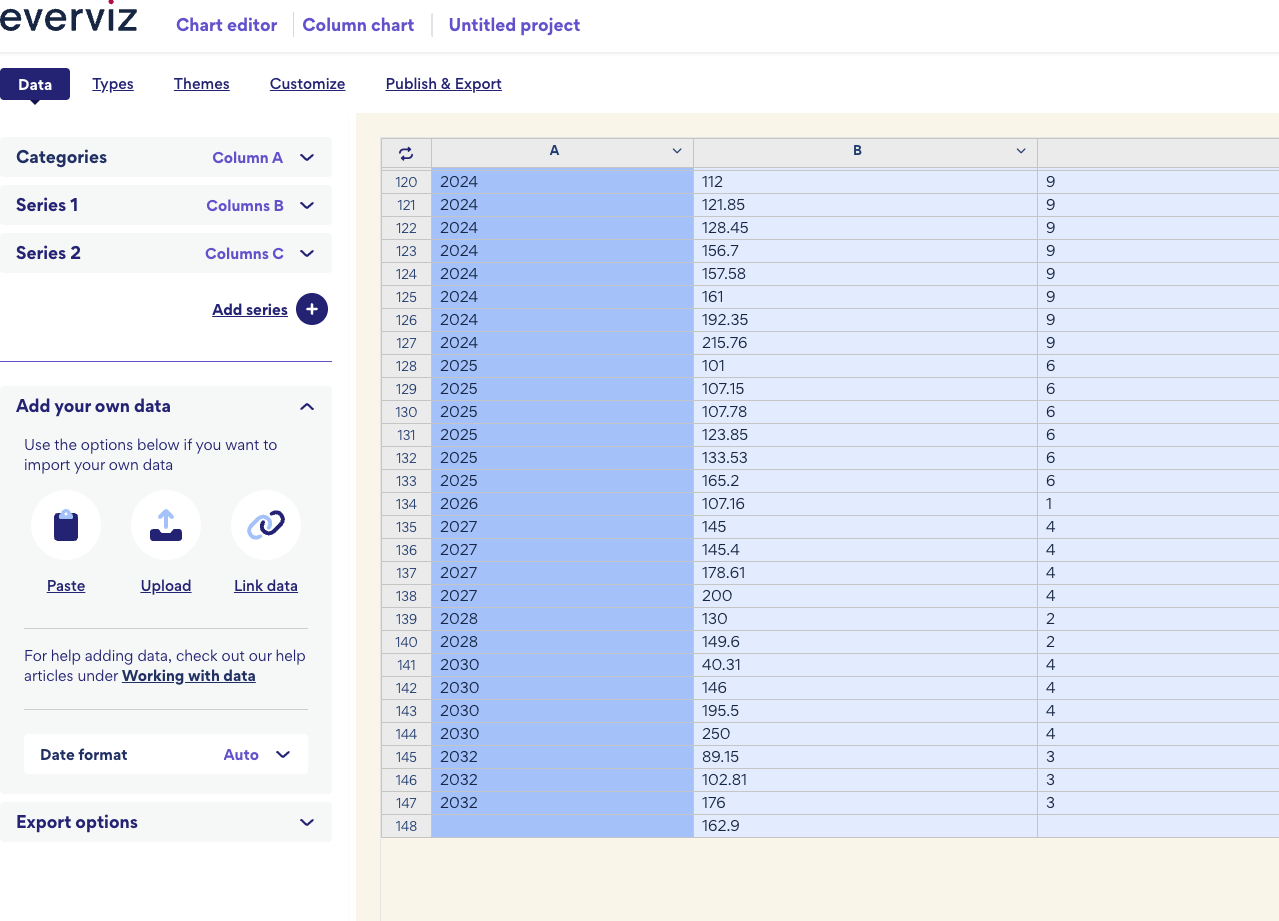 Regarding the X-axis data issue, it would be helpful if you could publish the latest version of the chart and share the public link with me so I can investigate further. It looks like it may be related to a column assignment issue. Could you please check which column is assigned as the category in the data section? It should be set to the year column.