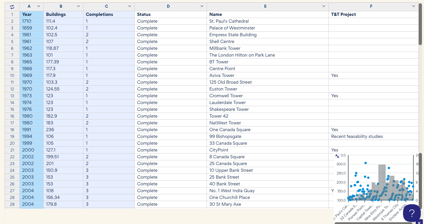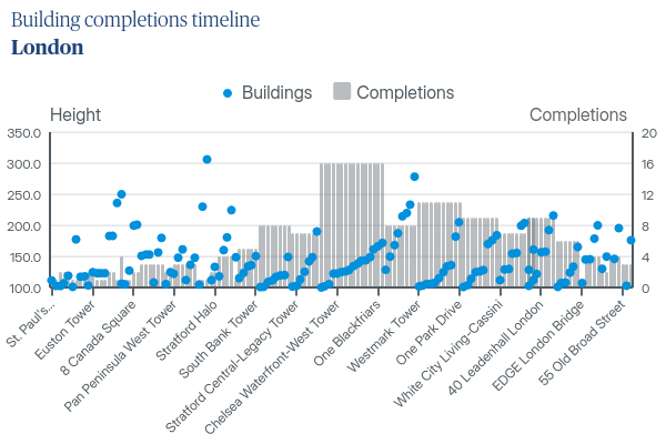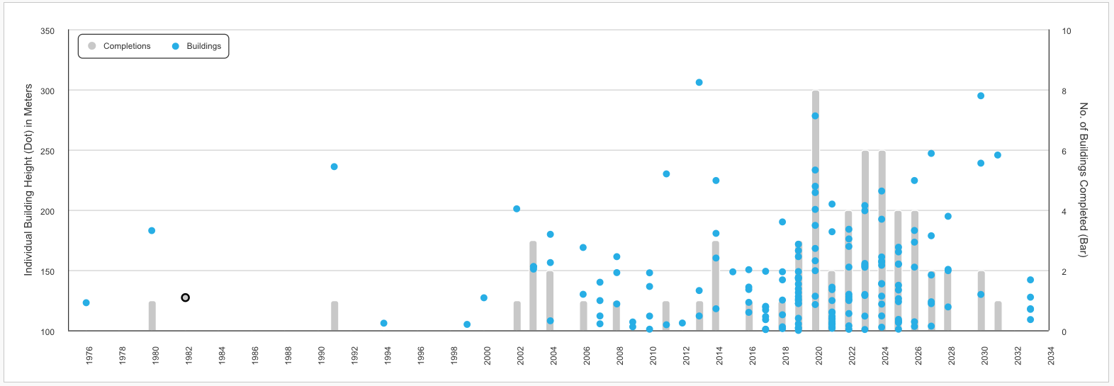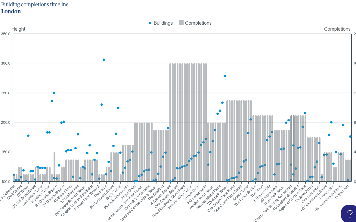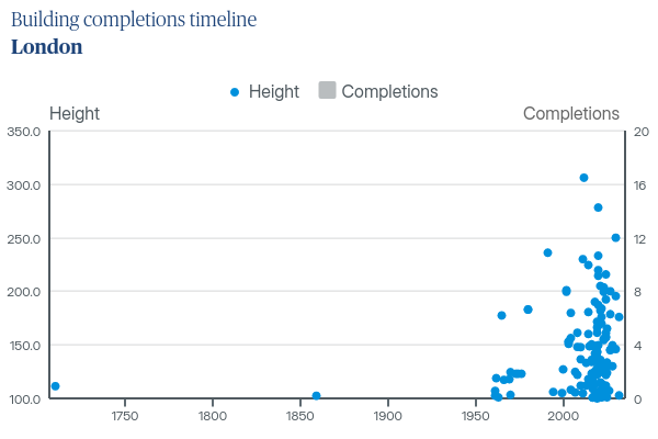 On the Y-axis (left) is Hight of buildings (which correlate with the X-axis of the year they were completed)